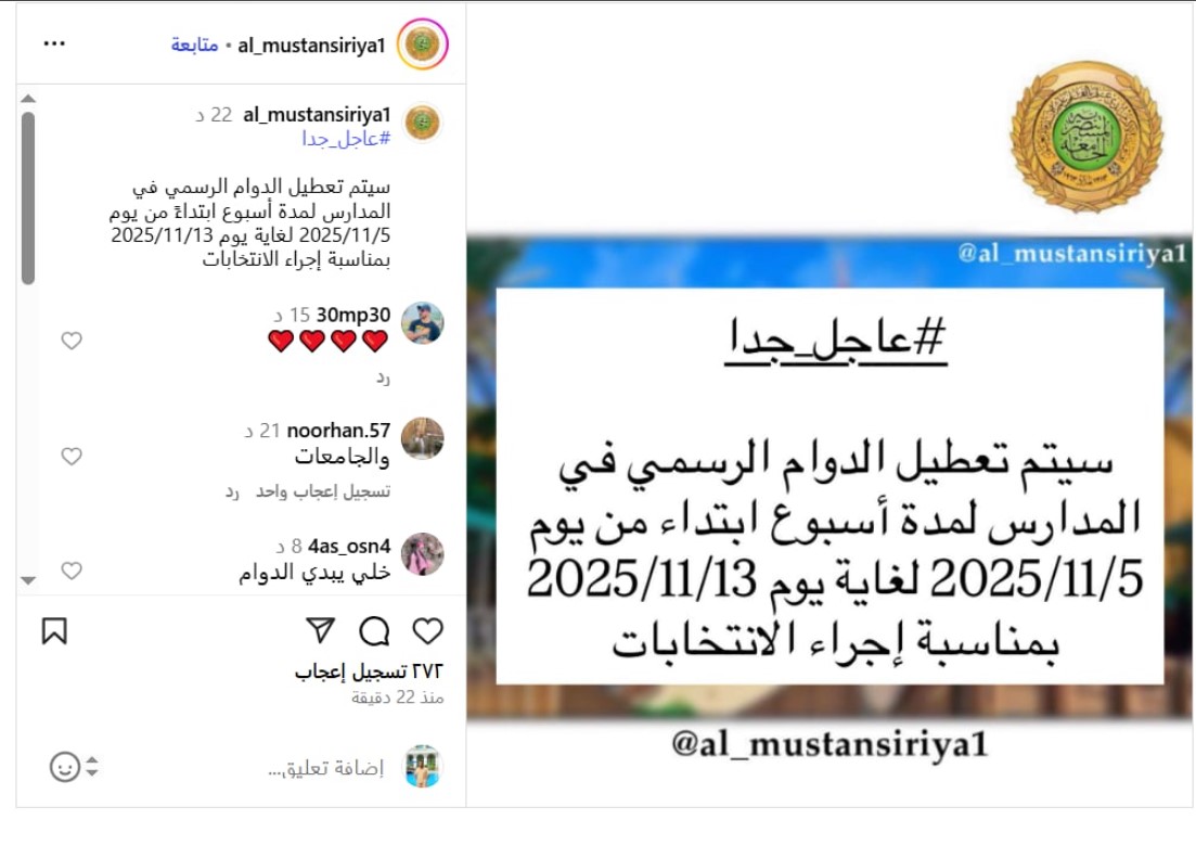 حقيقة تعطيل الدوام الرسمي في كافة المدارس الحكومية والاهلية العراق من 11/1 ولغاية 11/15 بسبب الانتخابات